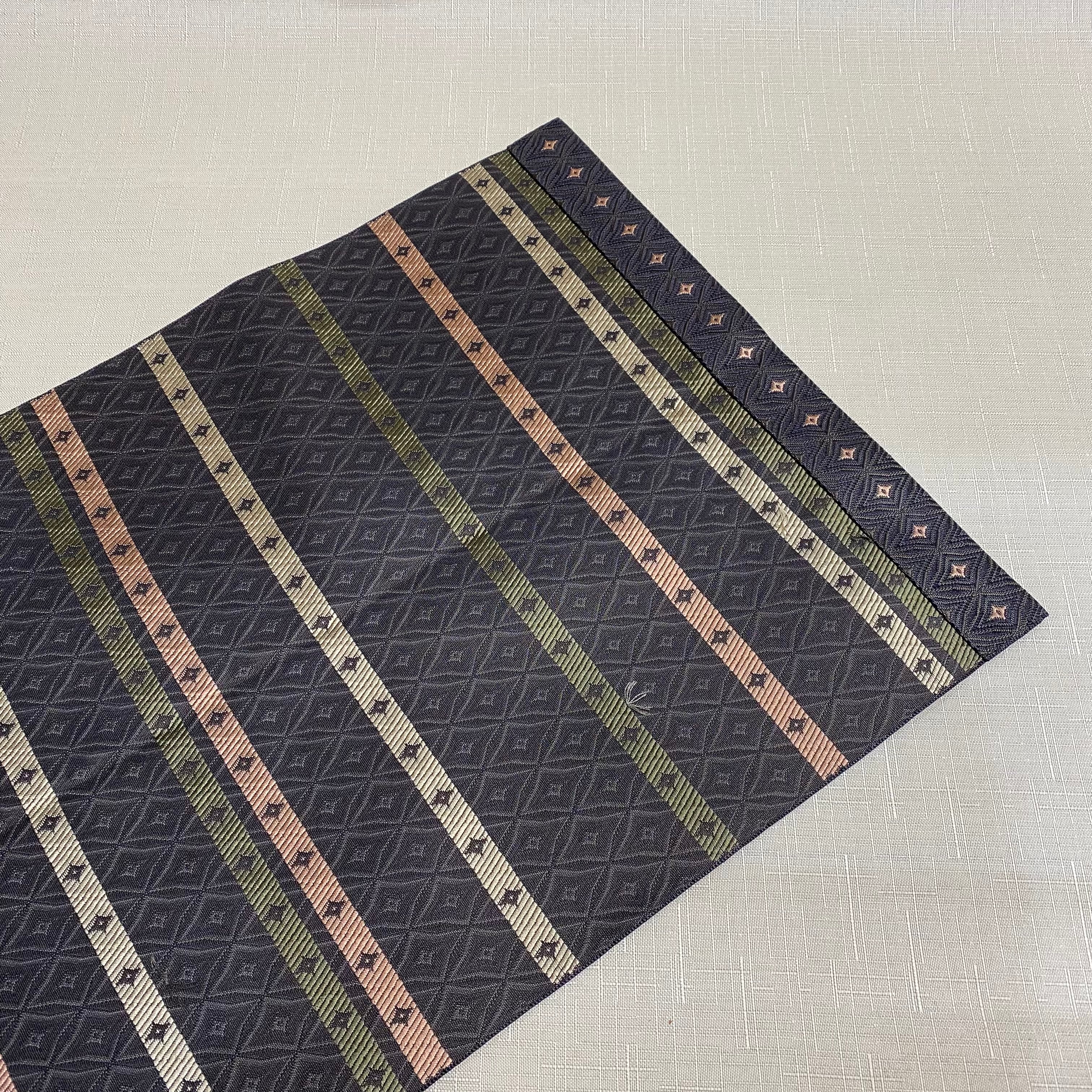 ハリのある手触りで、光沢のある「七宝繋」の柄を織り込んだ暗いオリーブ色紋錦織地織に、横線上に七宝の星の柄を白茶色、暗い珊瑚色、オリーブグリーンでオシャレに重ね織で仕上げた品です。