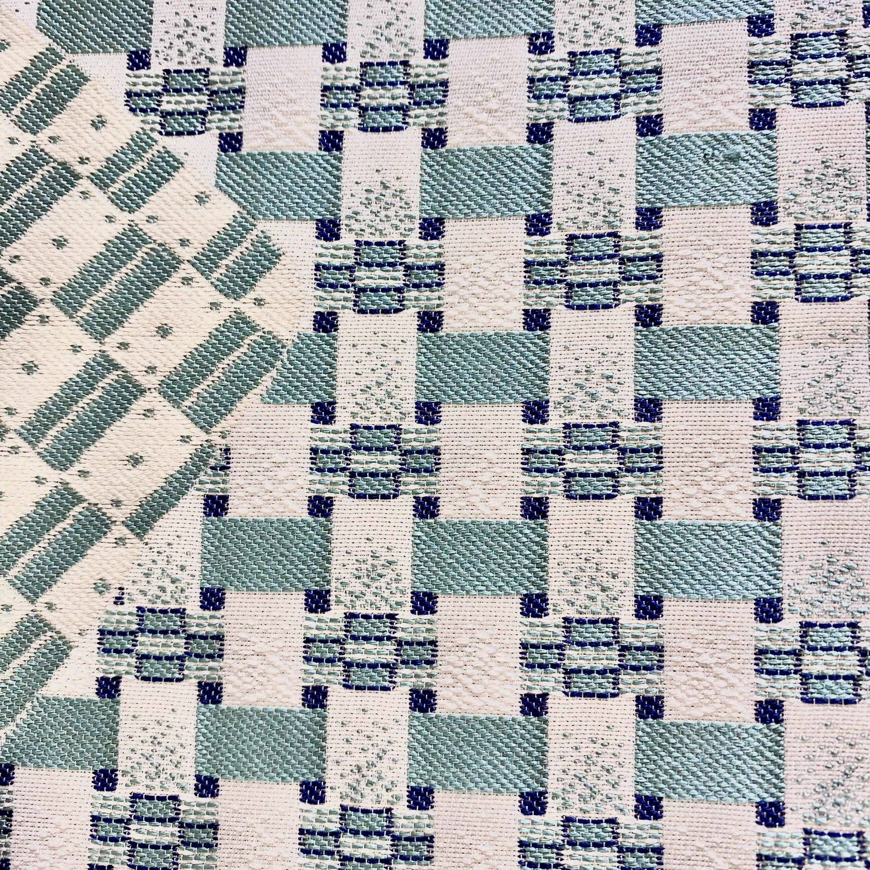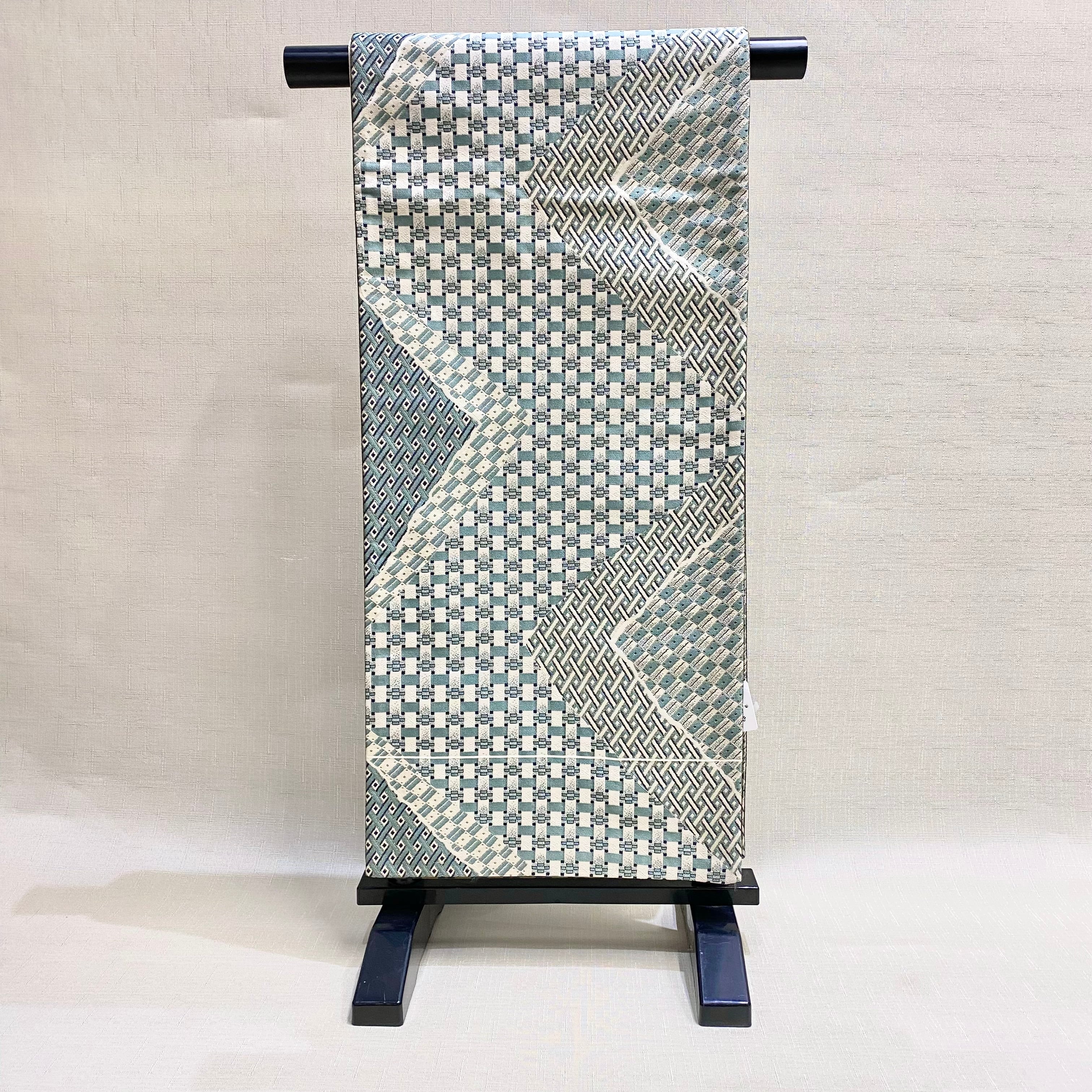 ハリのある手触りの白色錦織地織に、切り喰み取りに檜垣や違い格子などの柄を、青みの明るいミントグリーンにグレー、さらに銀糸をわずかに加えて織り上げた逸品です。