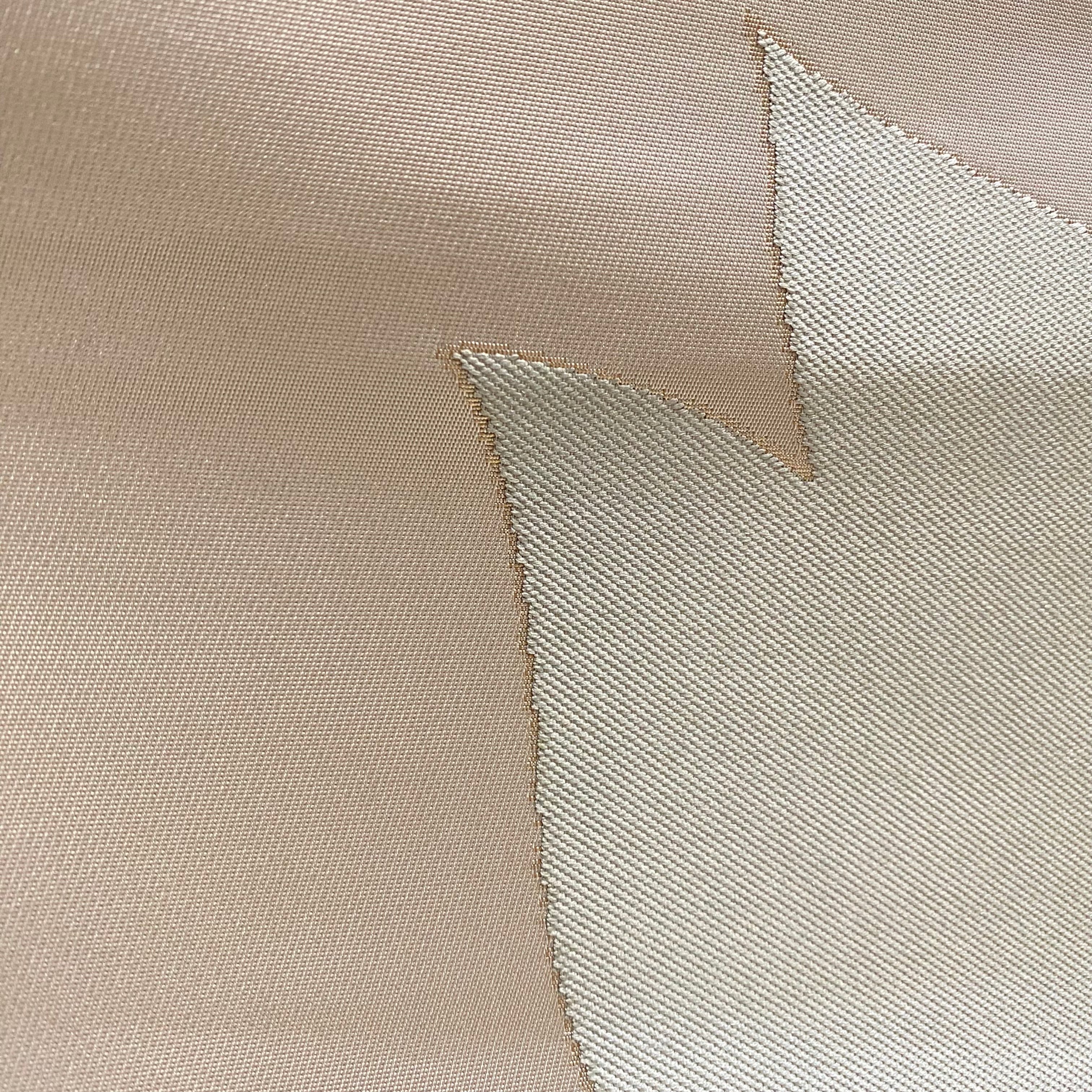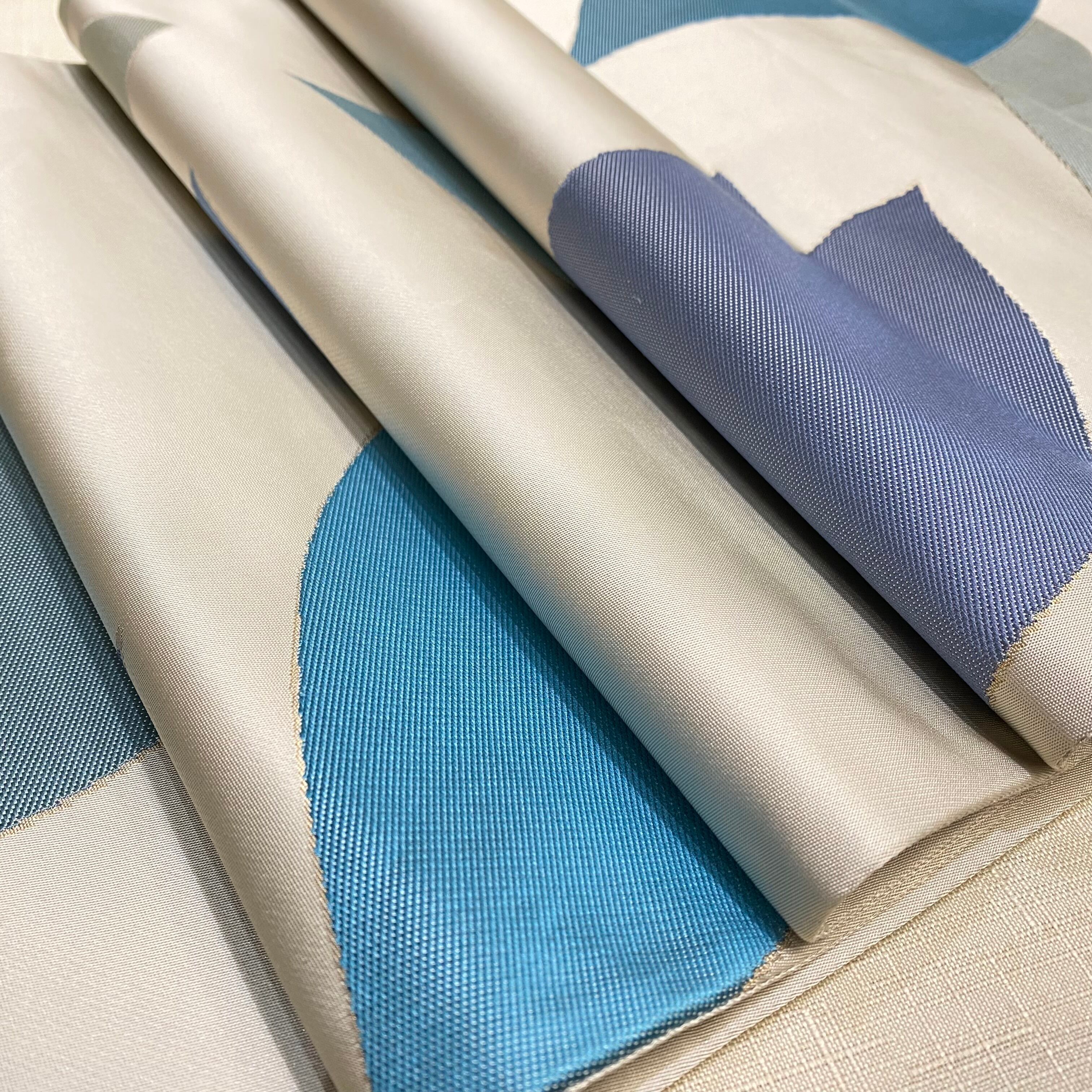 ハリのある手触りの銀鼠色錦織地織に、大きな桜の花びらの柄を、鮮やかな水色、利休鼠、青みの藤鼠などを主に、輪郭に沿ってわずかな明るい金糸を加えて織り上げた逸品です。