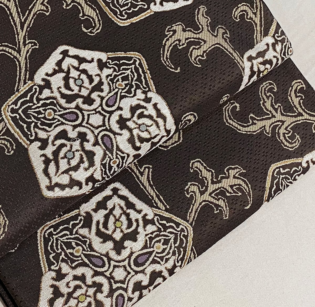 張りのある手触りで確りと打ち込まれたこげ茶で小さな菱柄を織り込んだ錦地織りに、蔓華紋の柄を薄茶や紫・黄緑色などと金糸加え重ね織りした品。