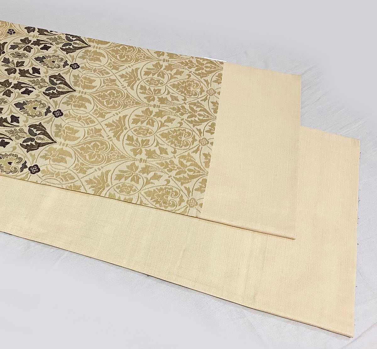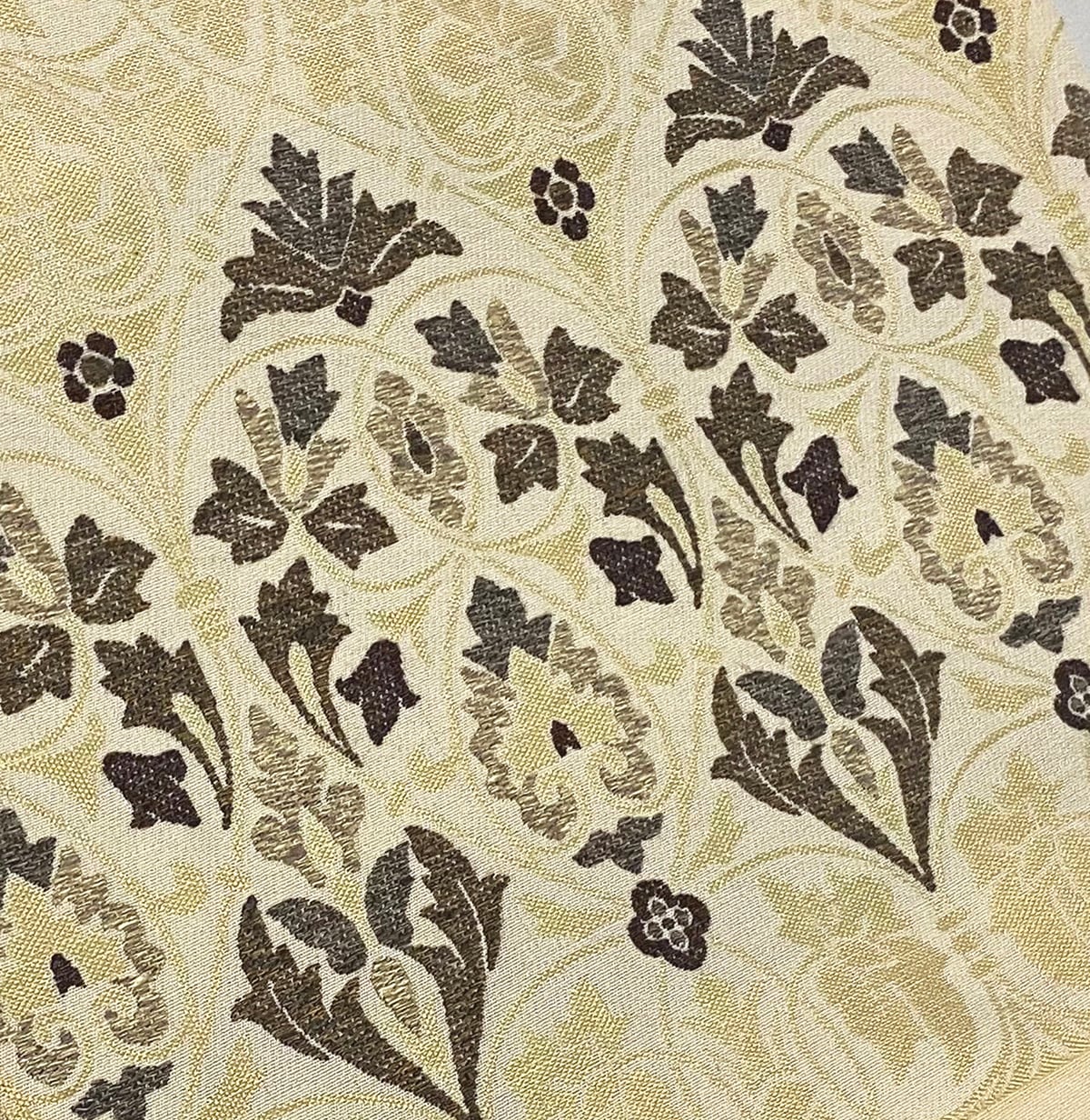 張りのある手触りで確りと打ち込まれ少しフシ糸を織り込んだ薄いベージュ色の紬地織りに、華紋柄を茶色濃淡やグレーなどで重ね織りした品。