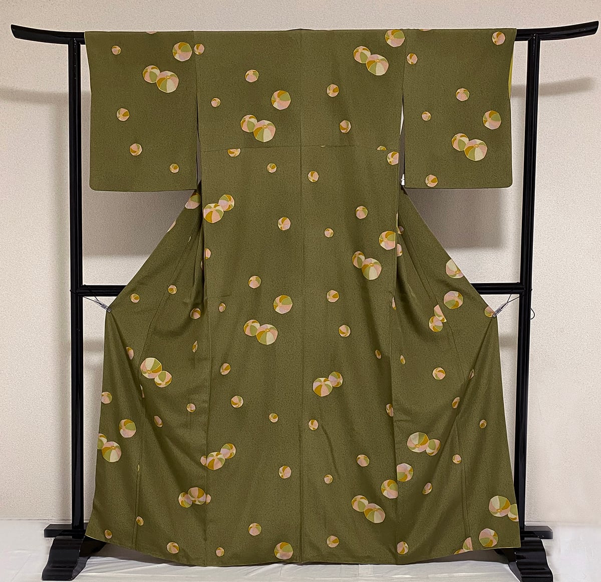 シャリ感のある手触りの一越の生地をオリーブ色に地色濃淡の真砂を重ねて地染めし、紙風船の柄をウグイス色や金茶・桃色などで重ね染めした品。