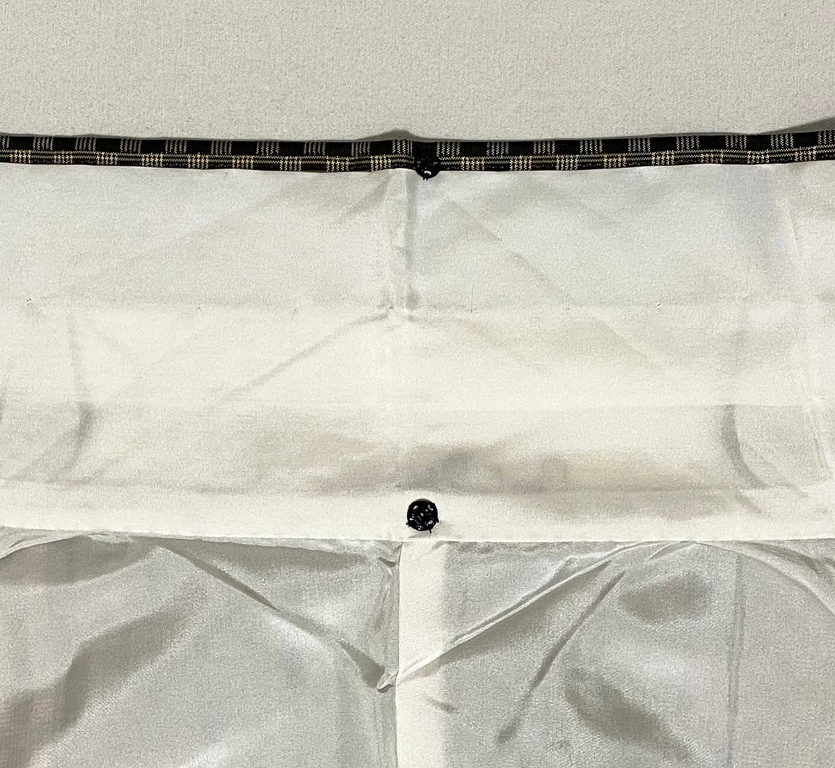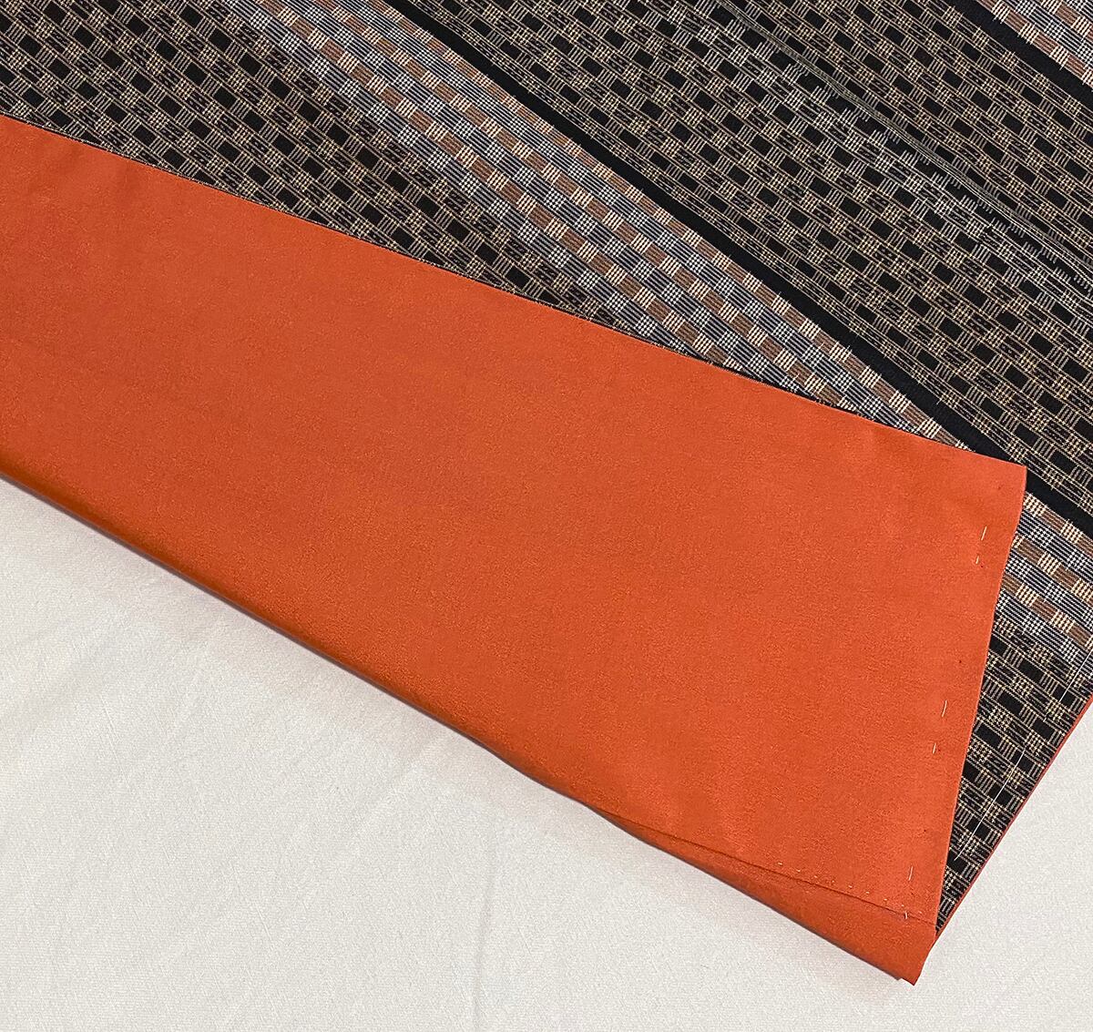八掛けは正絹渋い丹色無地で胴裏は正絹が付いた手縫い仕立て。
