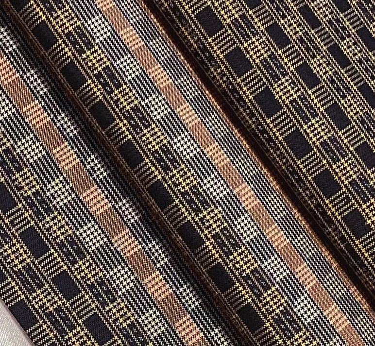 張りのある手触りで細糸で確りと打ち込まれた黒の本場大島紬の地織りに、金茶やくすんだ黄赤・白などの小さな絣で格子柄を重ね織りした品。