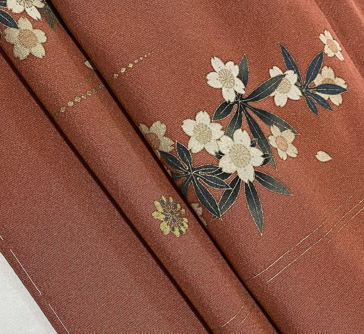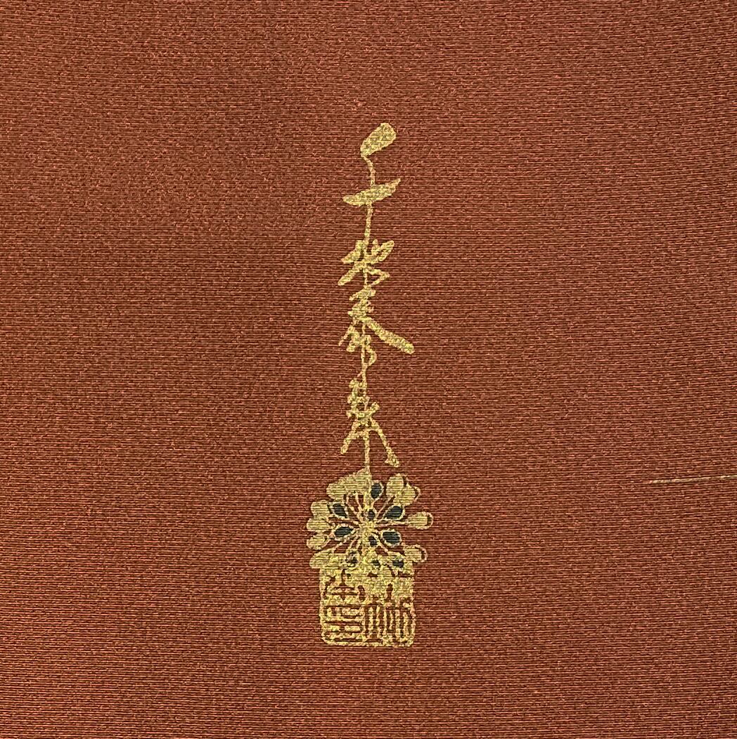 柔らかな手触りの一越の生地を赤みの茶色に地染めし、桜の花と蕾などの柄を白茶とモスグリーンなどに金箔を加え重ね染めした品。