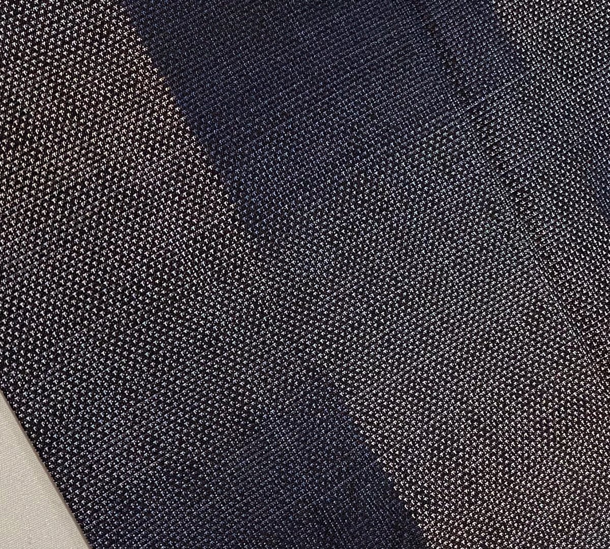 張りのある手触りで細糸で確りと打ち込まれた黒泥本場大島紬地織りに、市松暈しの柄を藍色に白・深緑色などを加えた九マルキ縦横絣で丁寧に重ね織りした品。