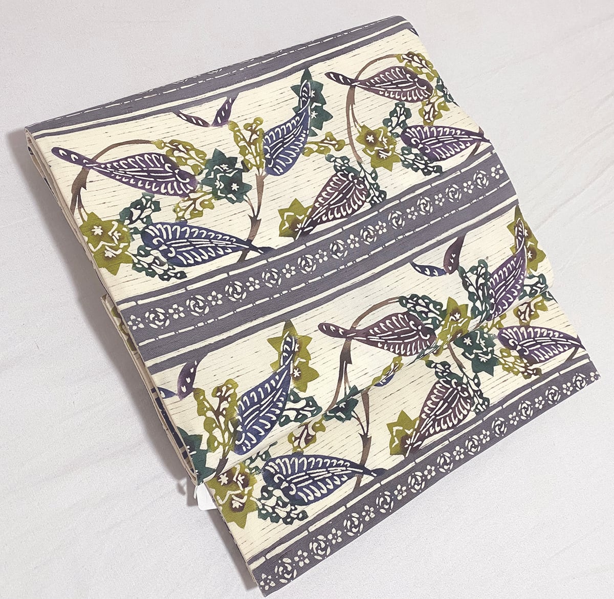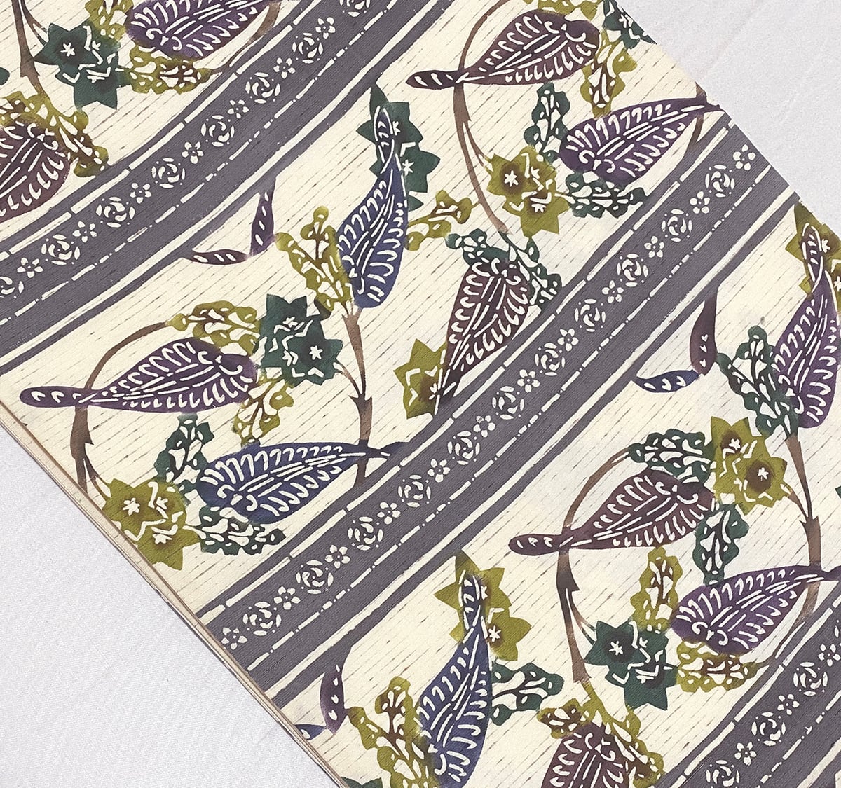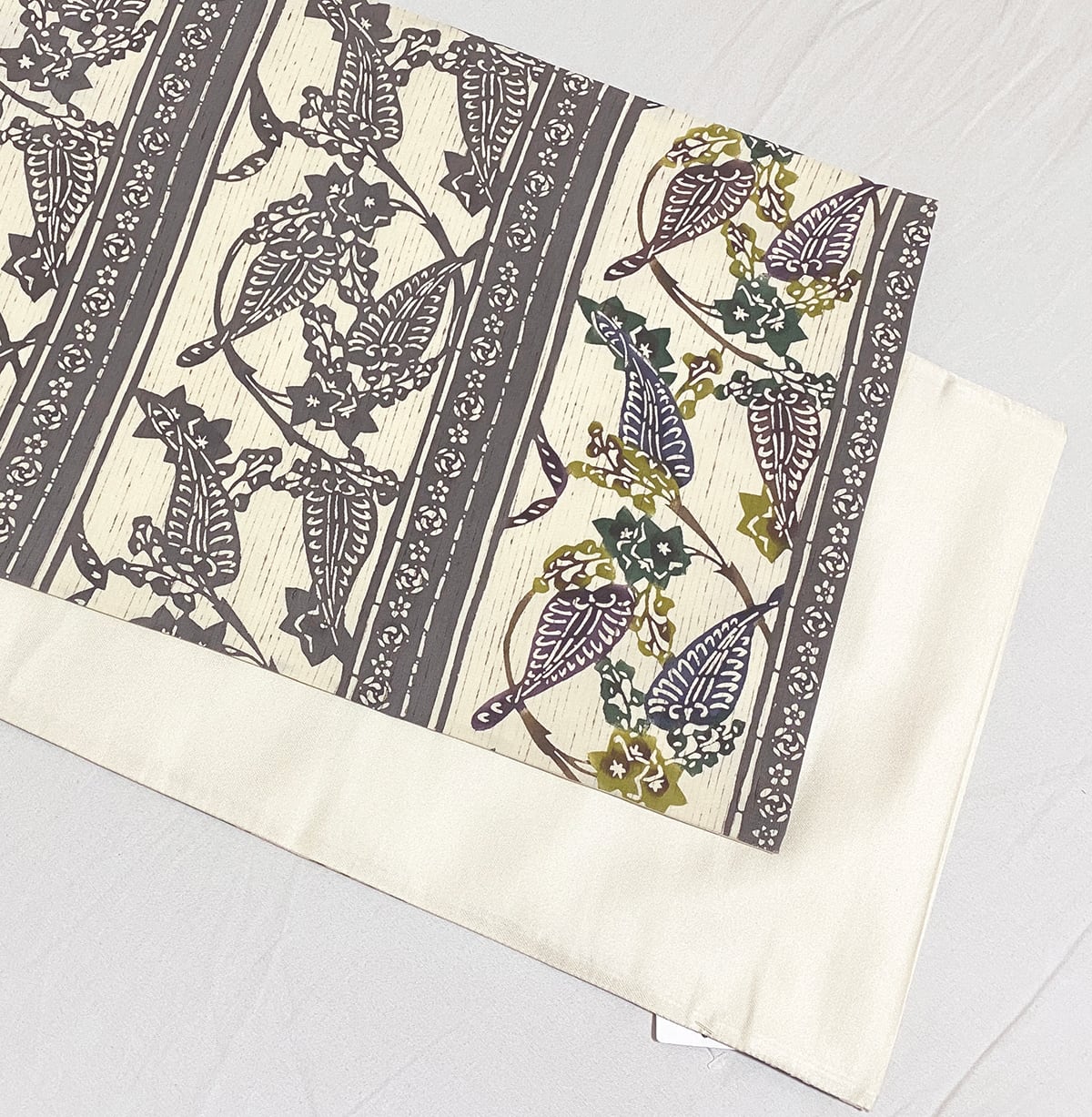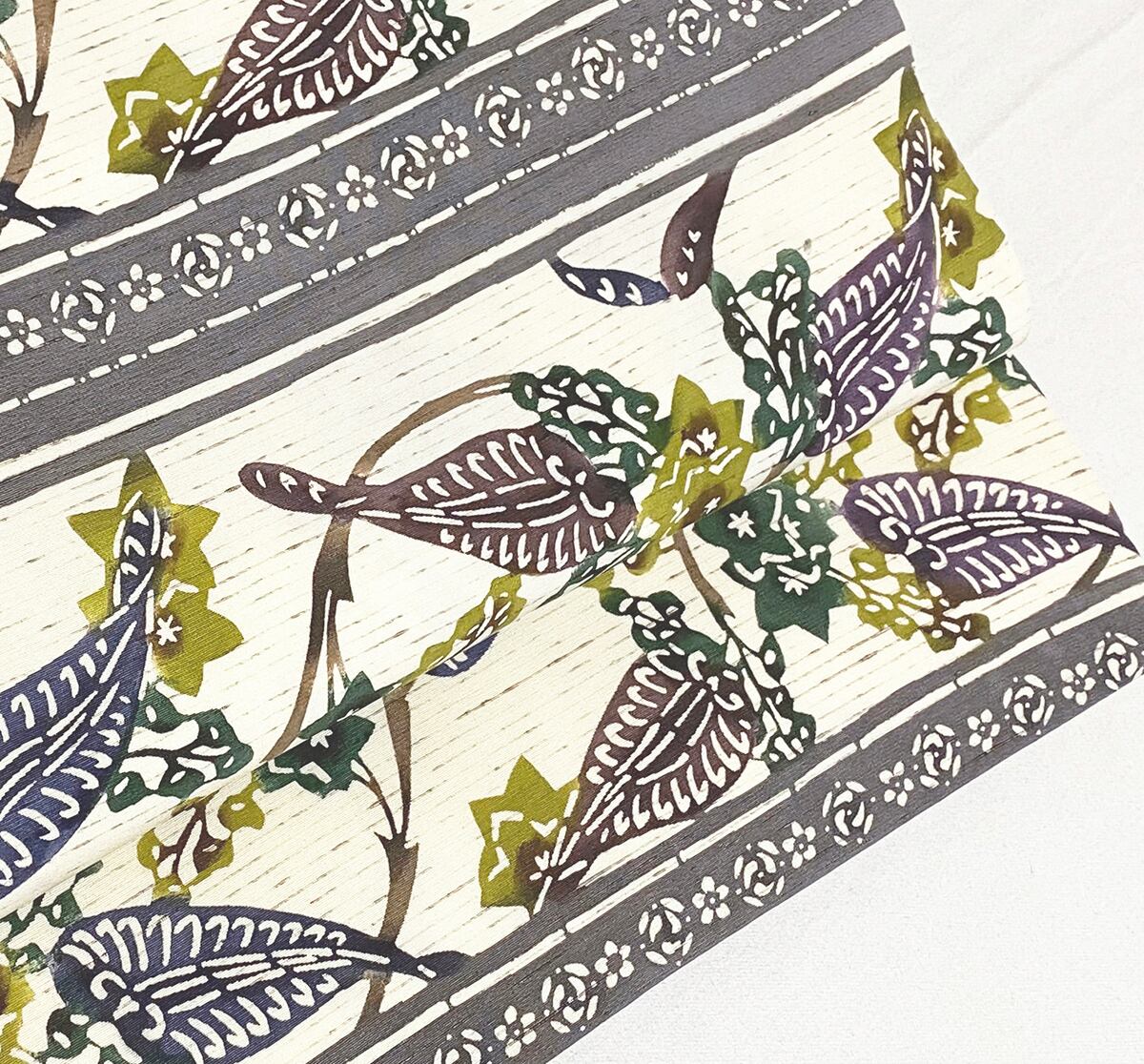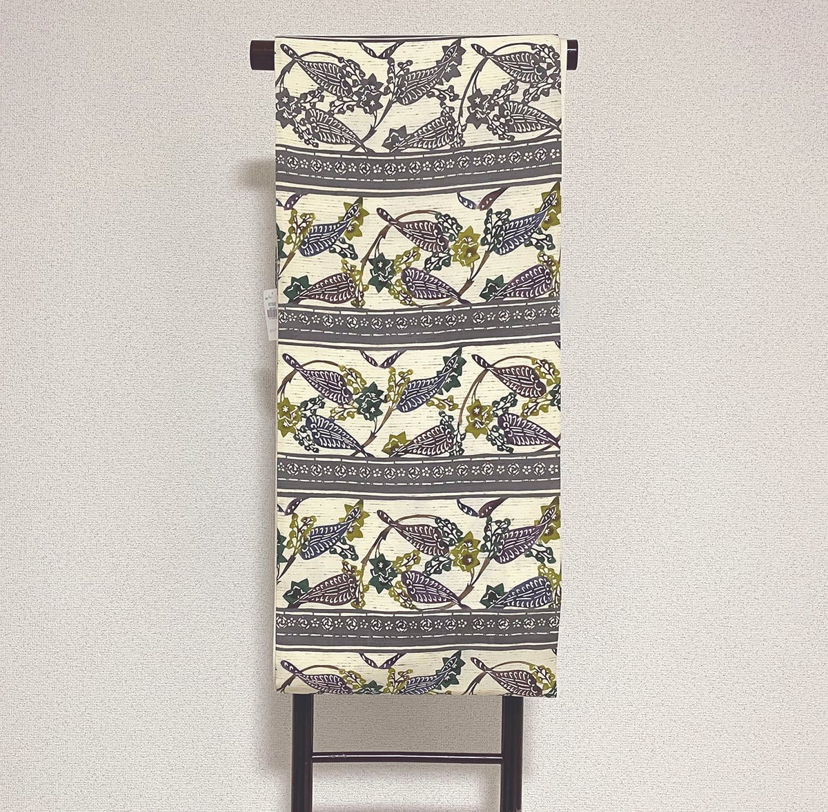 スベリの良い手触りで横糸に暗い紫色のフシ糸を織り込んだ紬の生地を淡いクリーム色に地染めし、横段取り枝花や抽象柄をくすんだ黄緑色や江戸紫・黒みの紺色・グレーなどの紅型染めで重ね染めした、お太鼓柄の品。