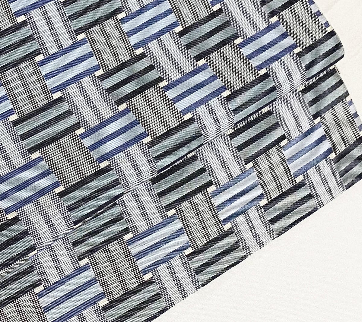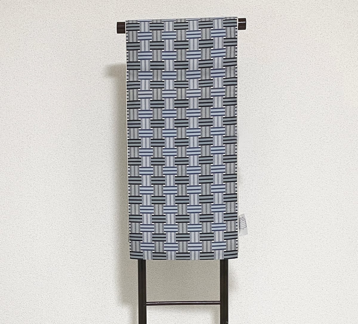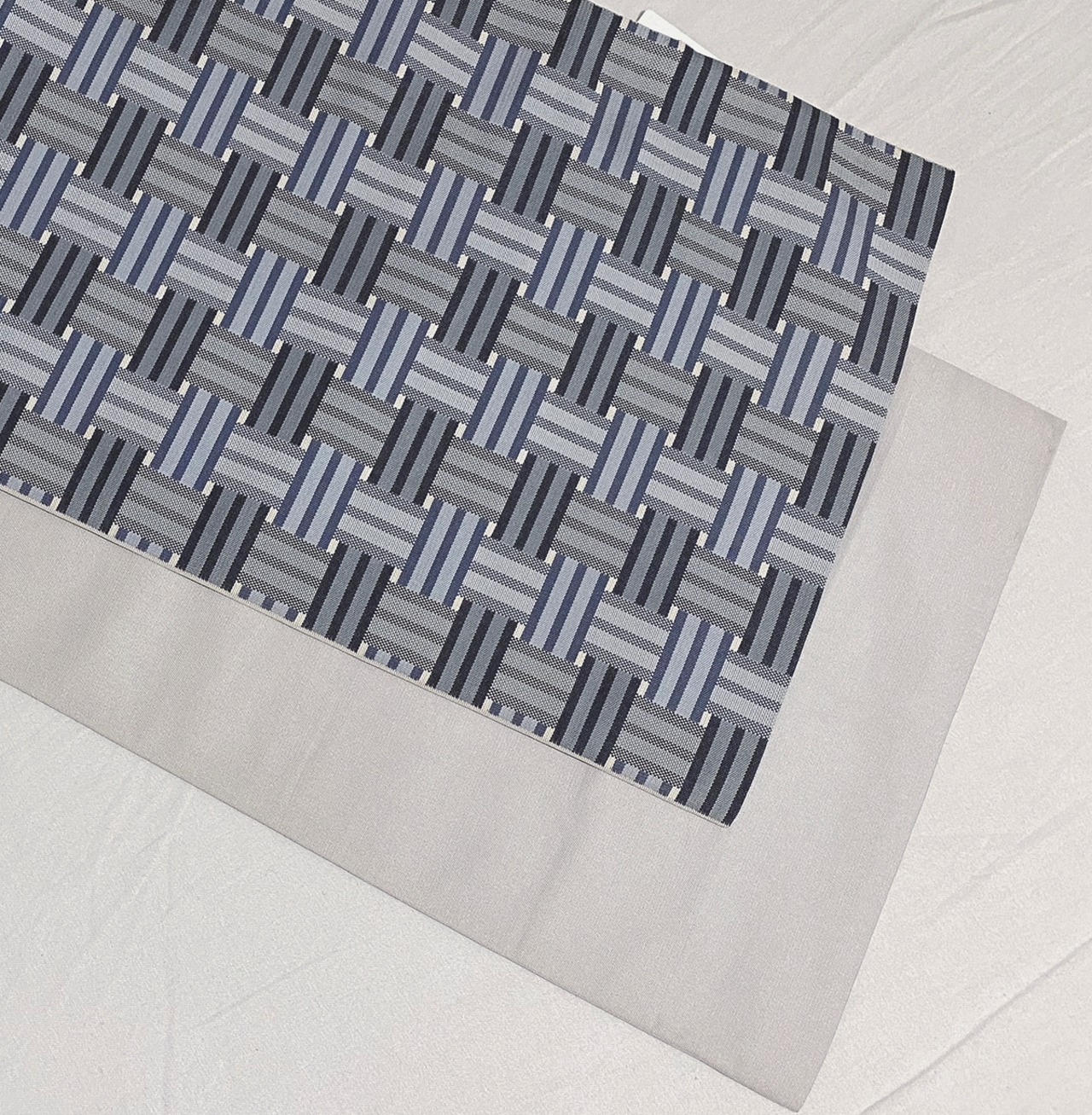 張りのある手触りの白の地織りに、網代の柄を緑色みのグレーや青みのグレー・黒などで織り上げた品。