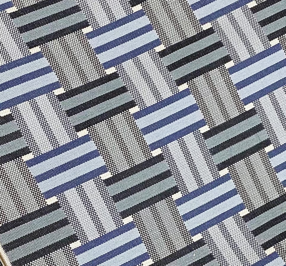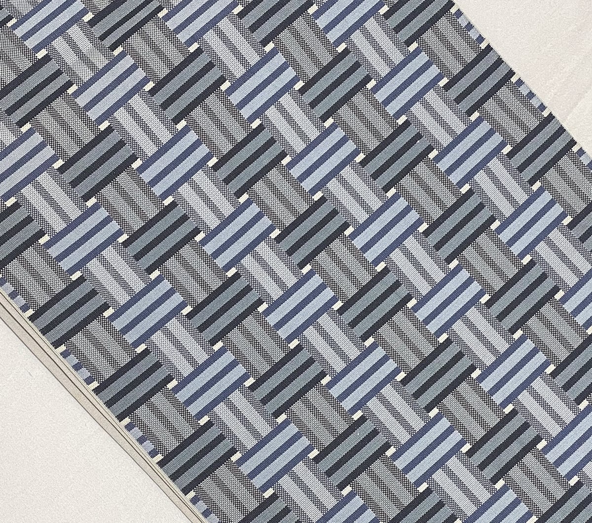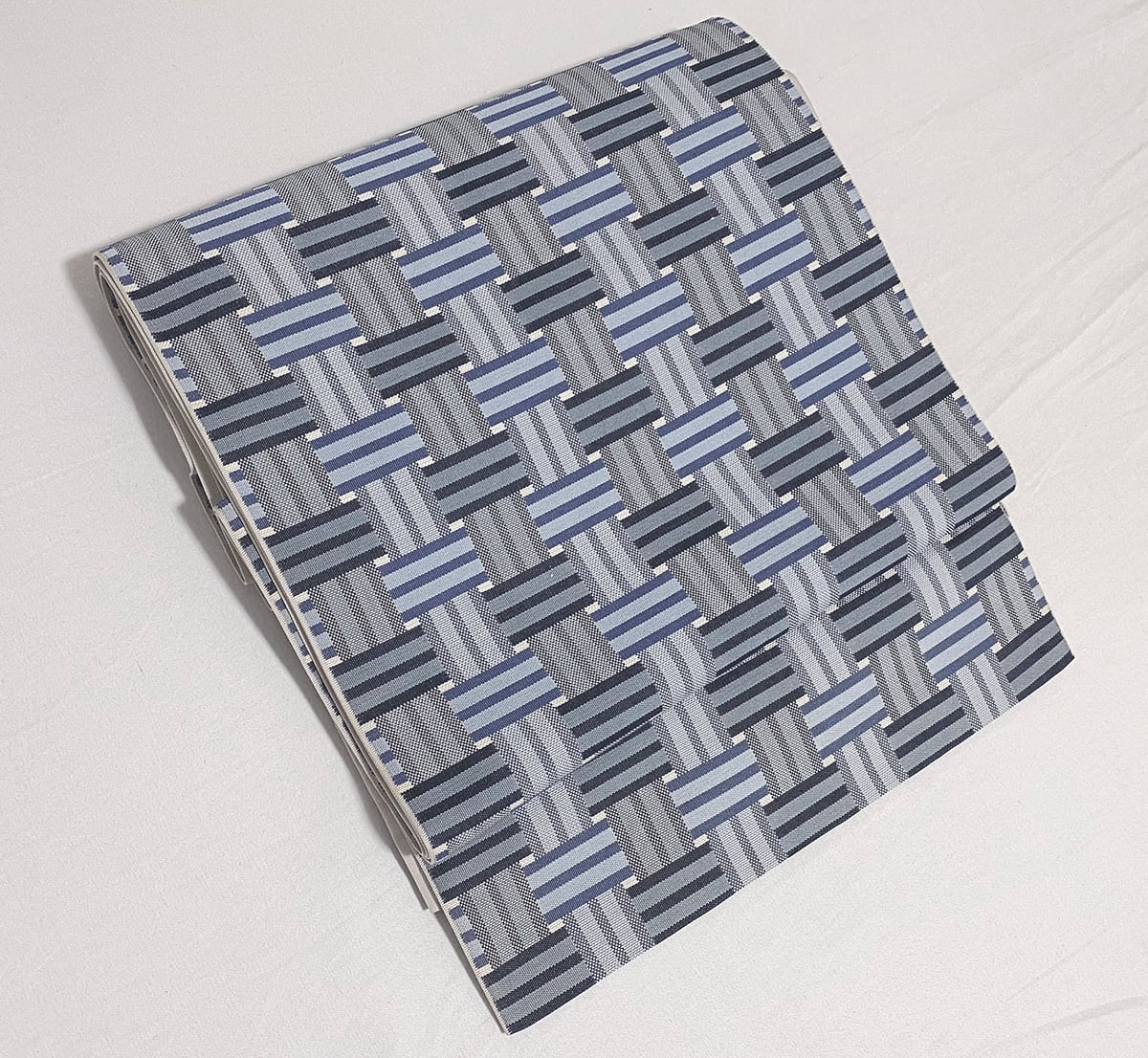 張りのある手触りの白の地織りに、網代の柄を緑色みのグレーや青みのグレー・黒などで織り上げた品。