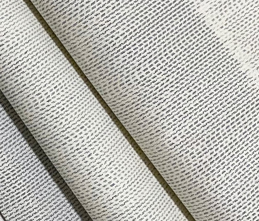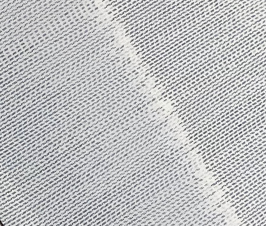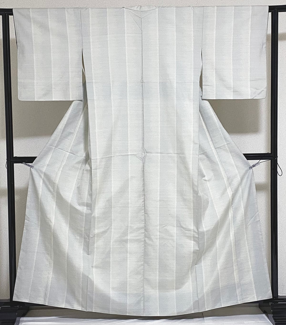 張りのある手触りで細糸で確りと打ち込まれた白大島紬地織りに、横線重ねで太い縦縞暈しの柄を青ネズ濃淡の横糸絣で丁寧に重ね織りした品。