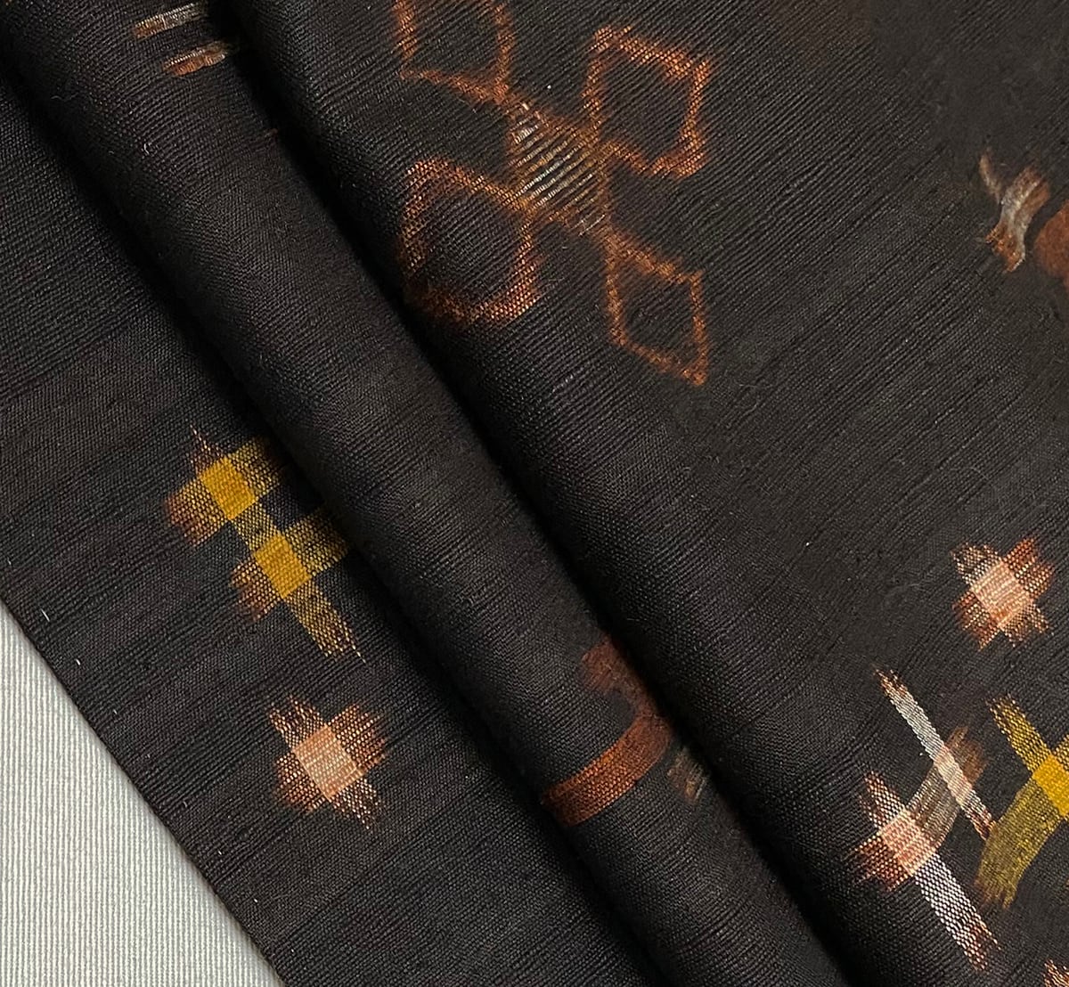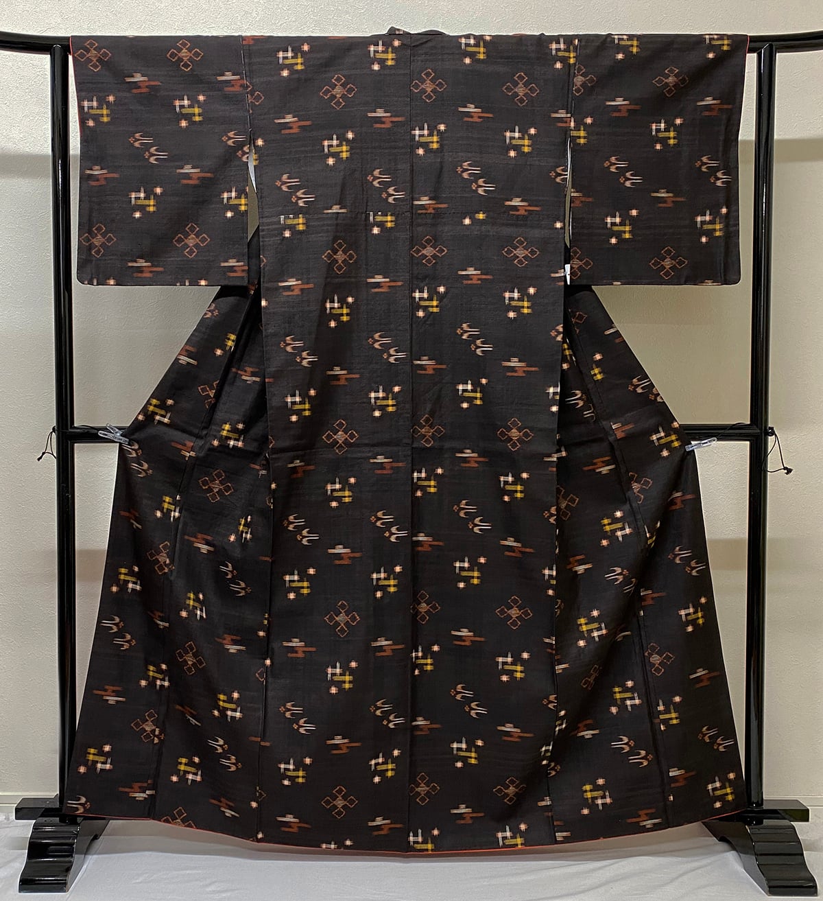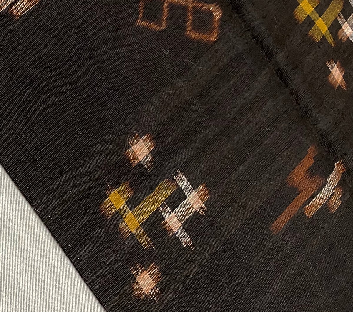 張りのある手触りで確りと打ち込まれ横糸にフシ糸を織り込んだ茶泥琉球久米島紬の地織りに、琉球絣の柄を金茶や生成り・赤茶色濃淡などの縦横絣で丁寧に重ね織りした品。