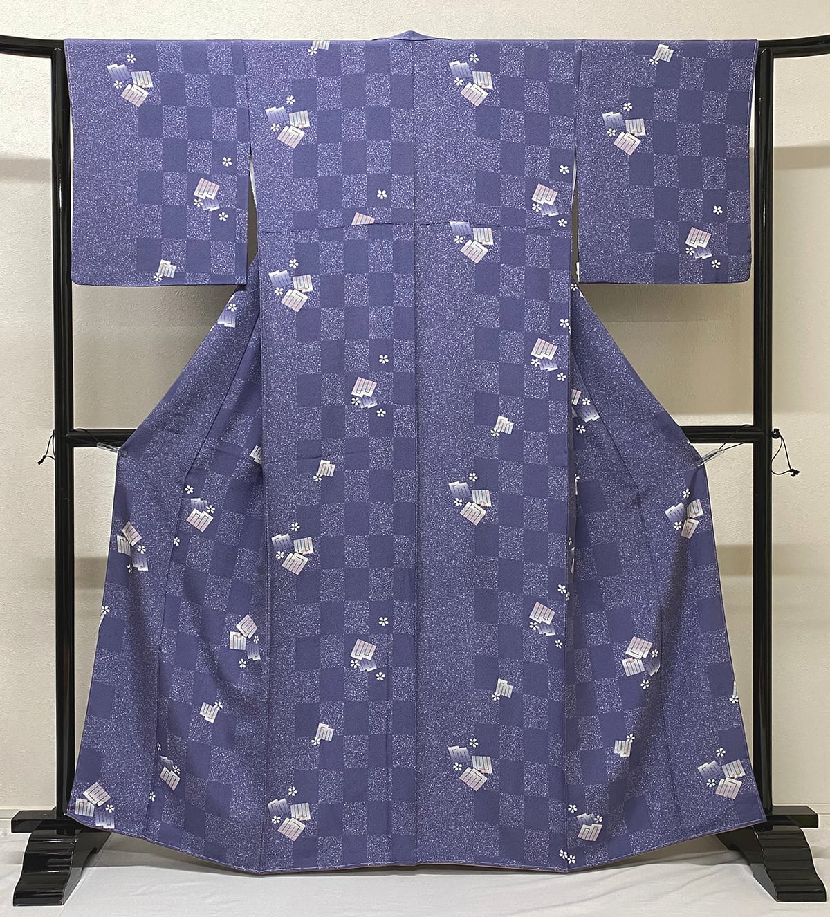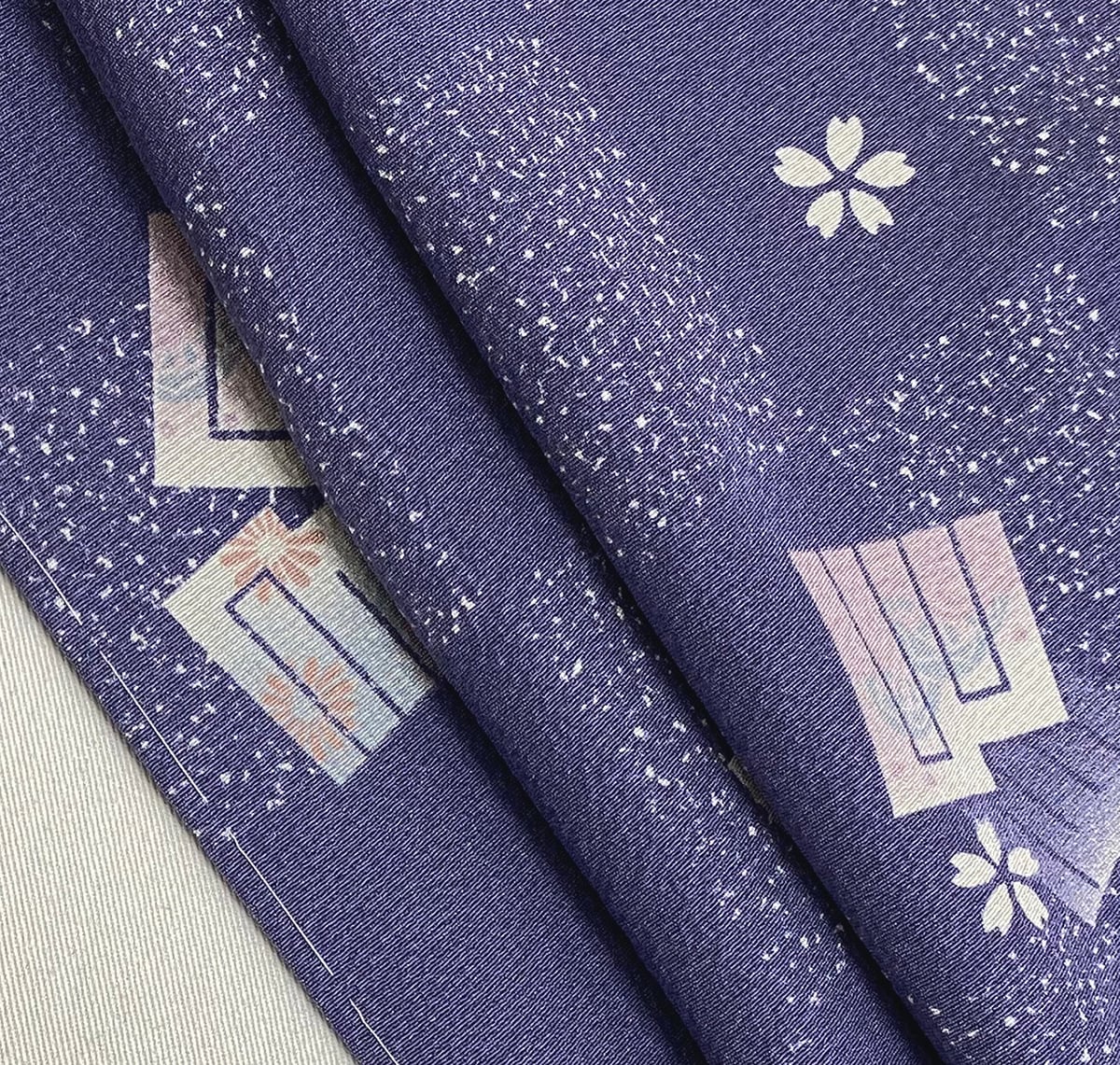 しなやかな手触りの横線の小さなフクレ織りを織り込んだ変わり一越の生地を藤色に白の真砂を重ねて市松に地染めし、源氏香や小桜の飛び柄を生成りや青ネズなどで重ね染めした品。