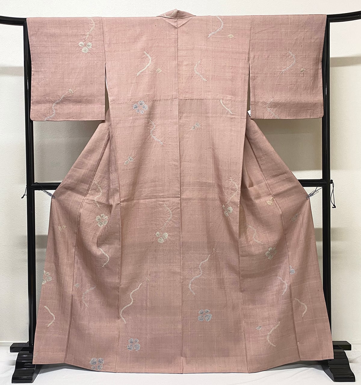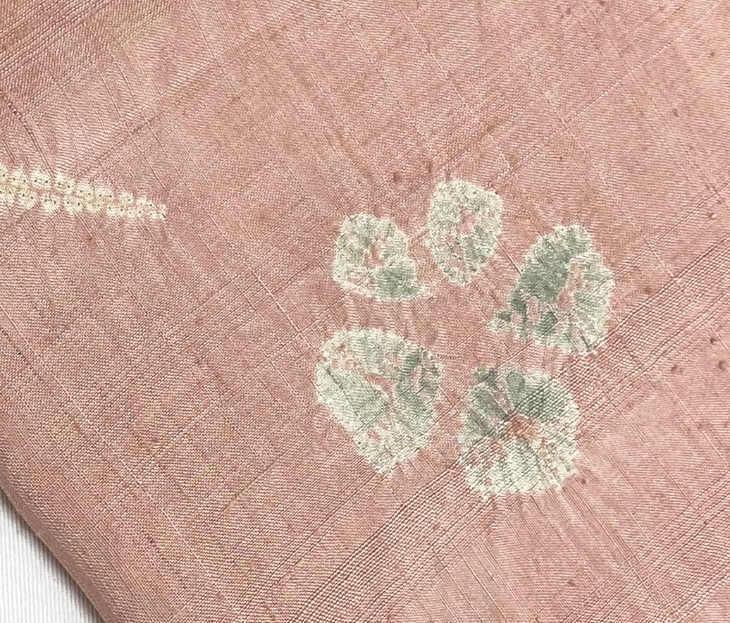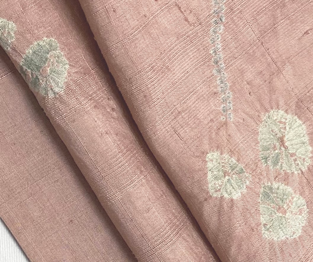 しなやかな手触りで縦横にフシ糸を織り込んだ紬の生地を落ち着いた退紅色に地染めし、花や葉などの柄をくすんだ鶸(ひわ)色や灰緑色などの絞り染めで重ね染めした品。
