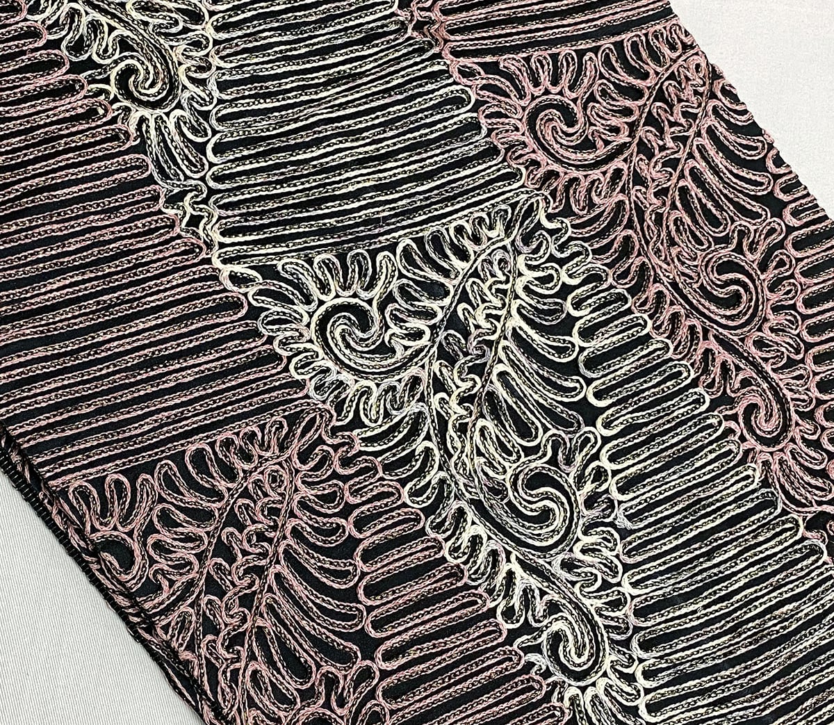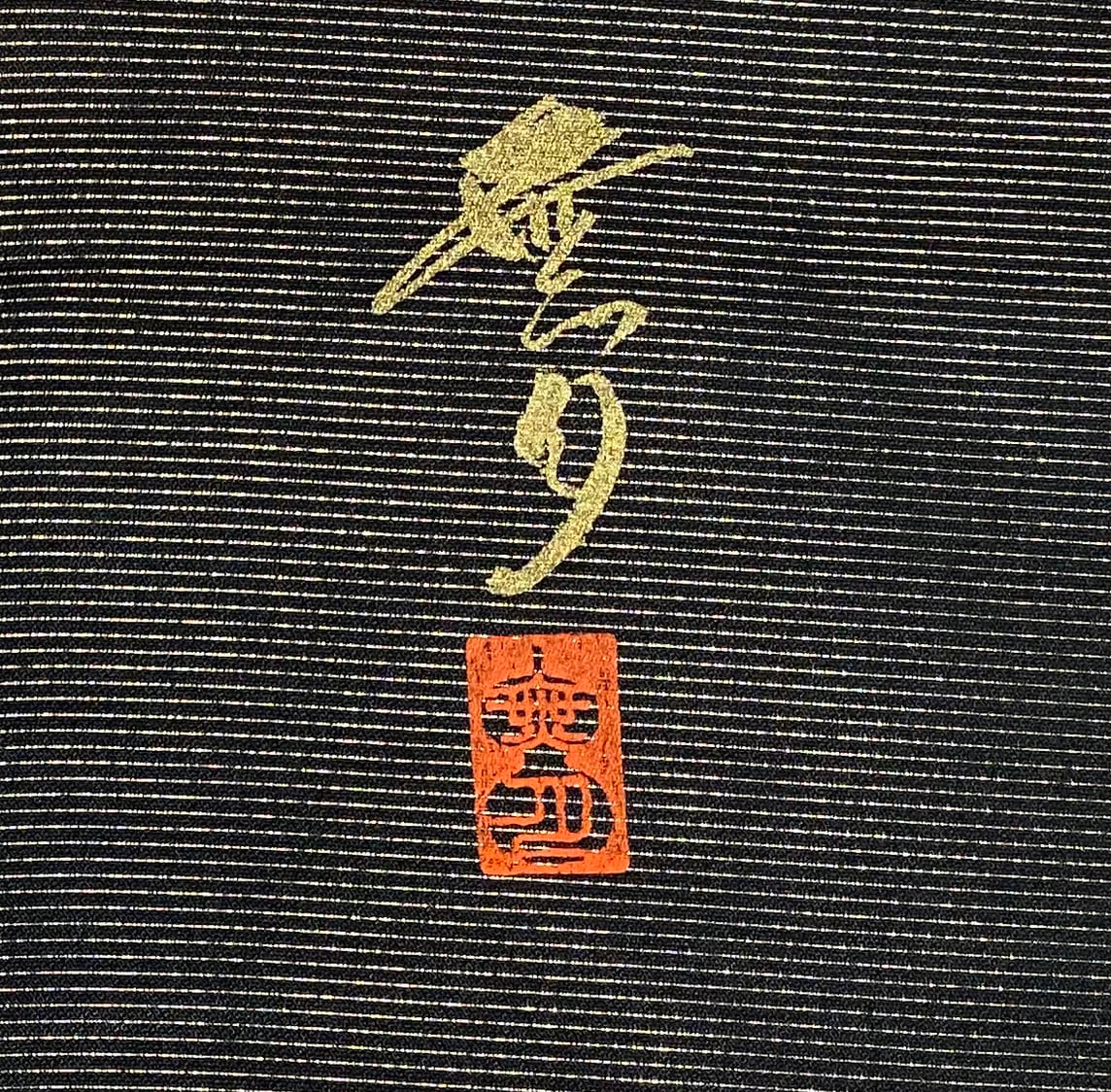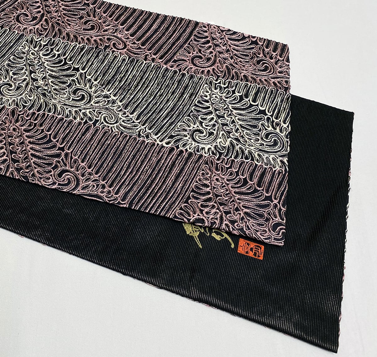 張りのある手触りの黒レース地織りに、三角繋ぎの柄中に、蛇行線やペイズリーの柄を白ネズと赤紫色の本場大島紬絣糸に金糸を加えお洒落に仕上げた、無月謹製の品。