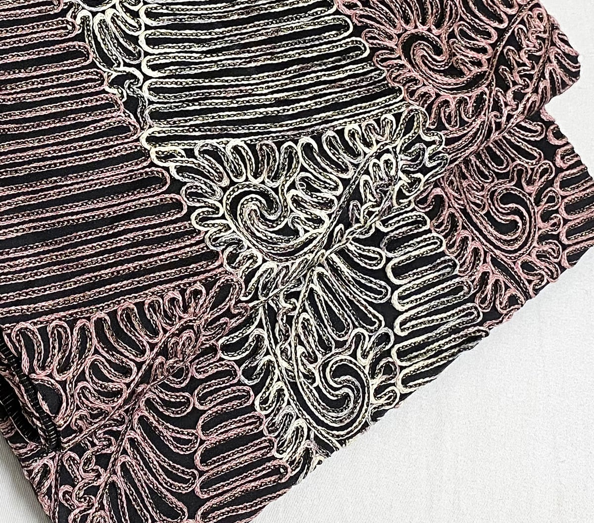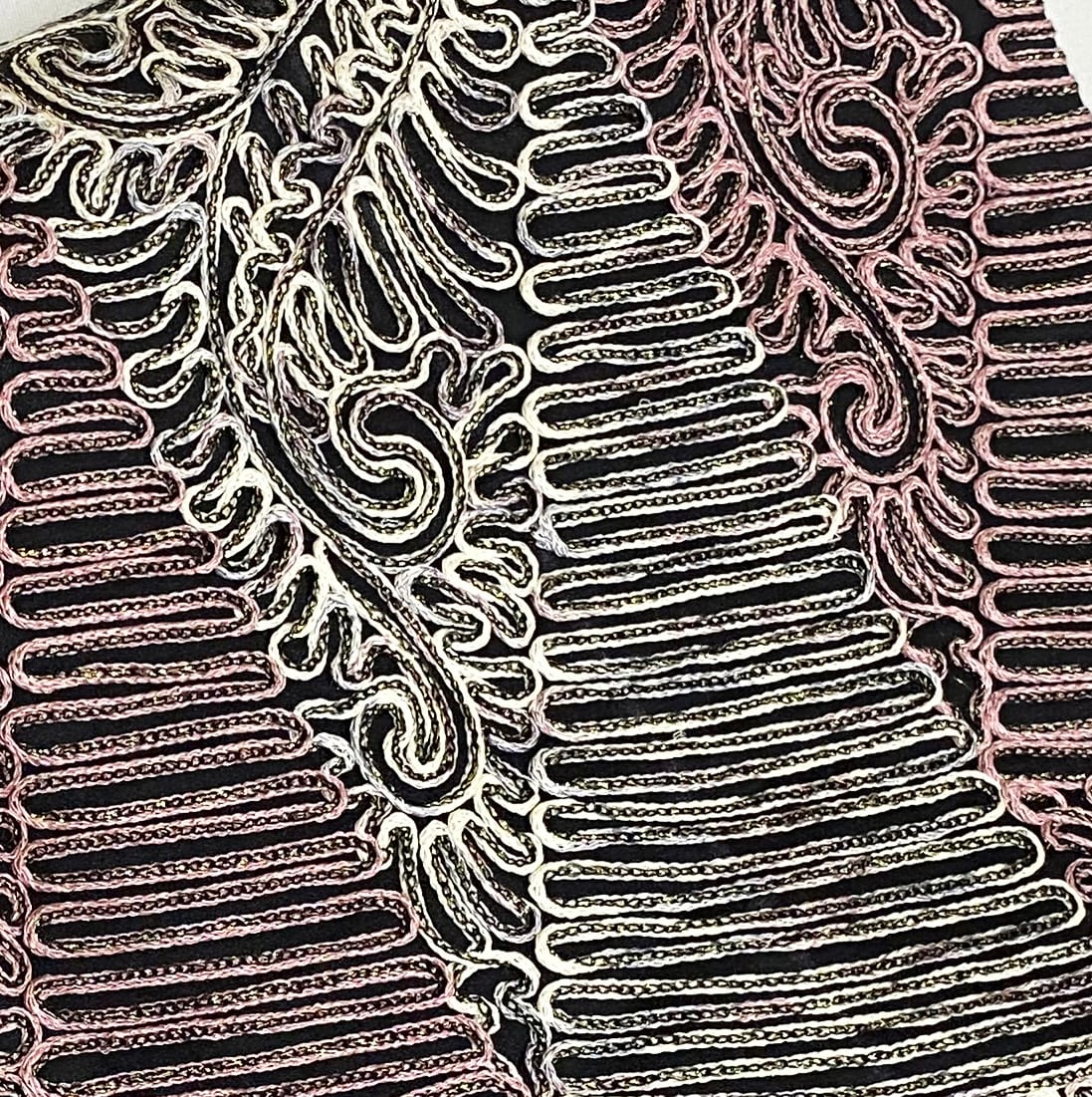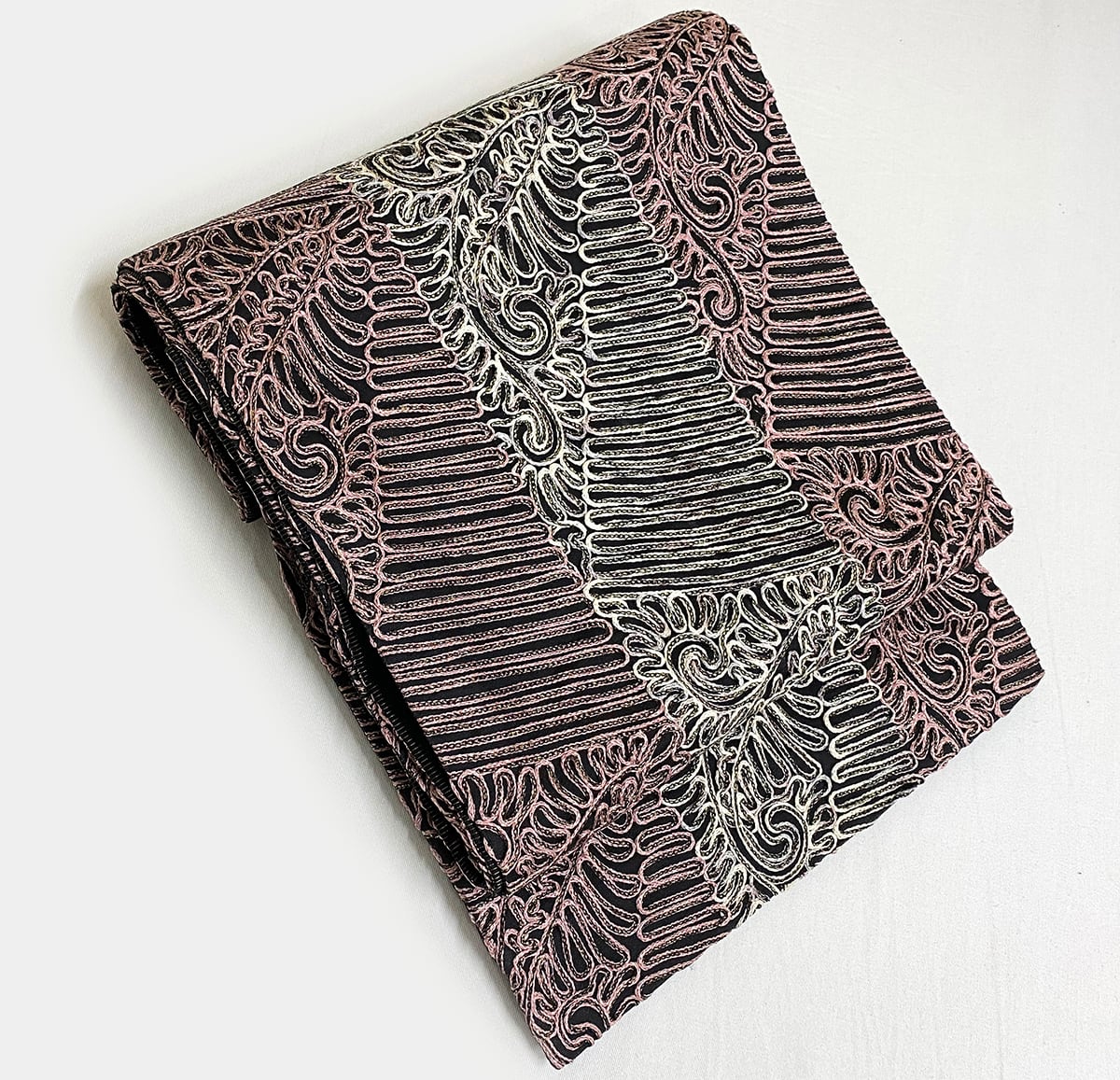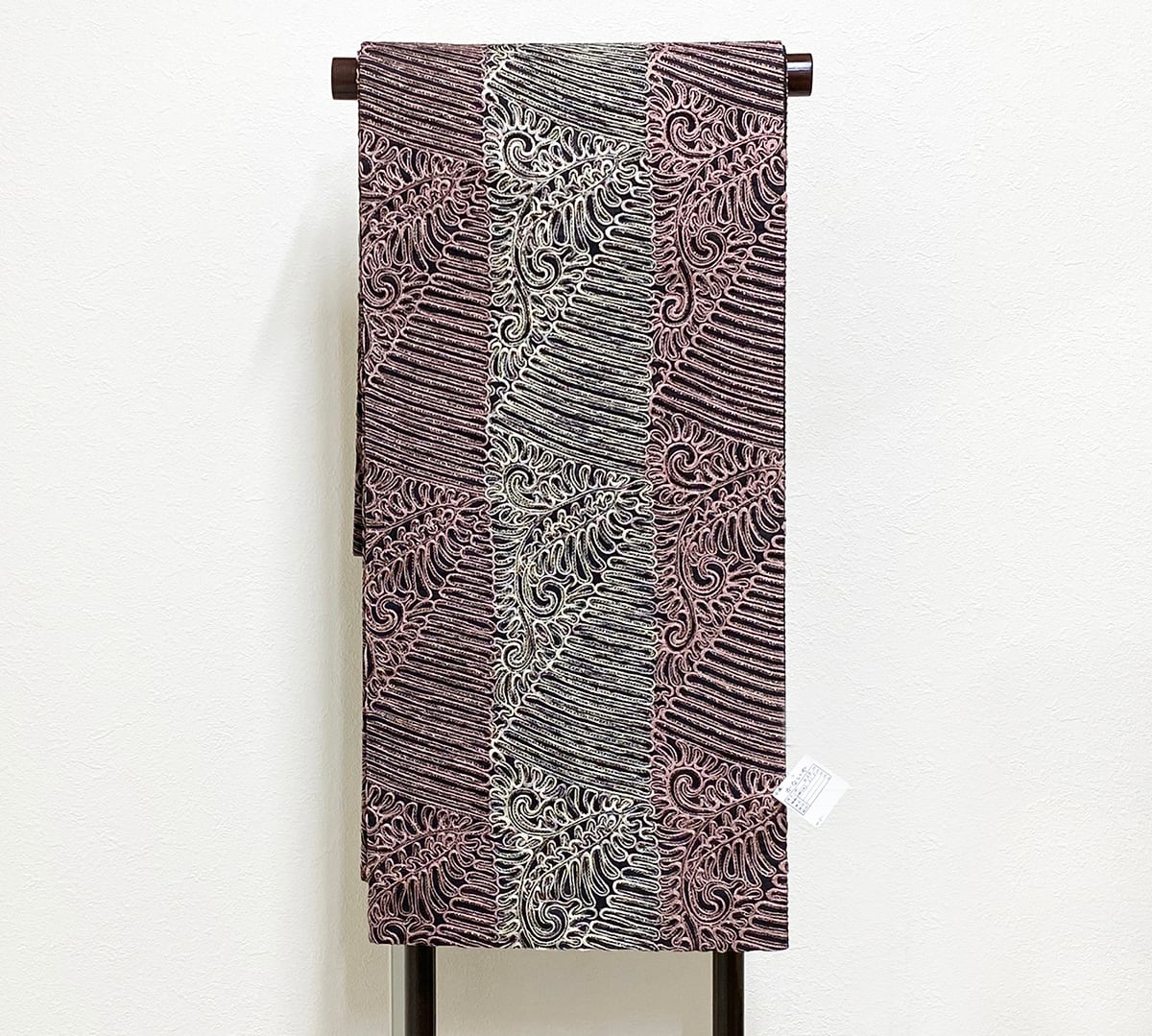 張りのある手触りの黒レース地織りに、三角繋ぎの柄中に、蛇行線やペイズリーの柄を白ネズと赤紫色の本場大島紬絣糸に金糸を加えお洒落に仕上げた、無月謹製の品。