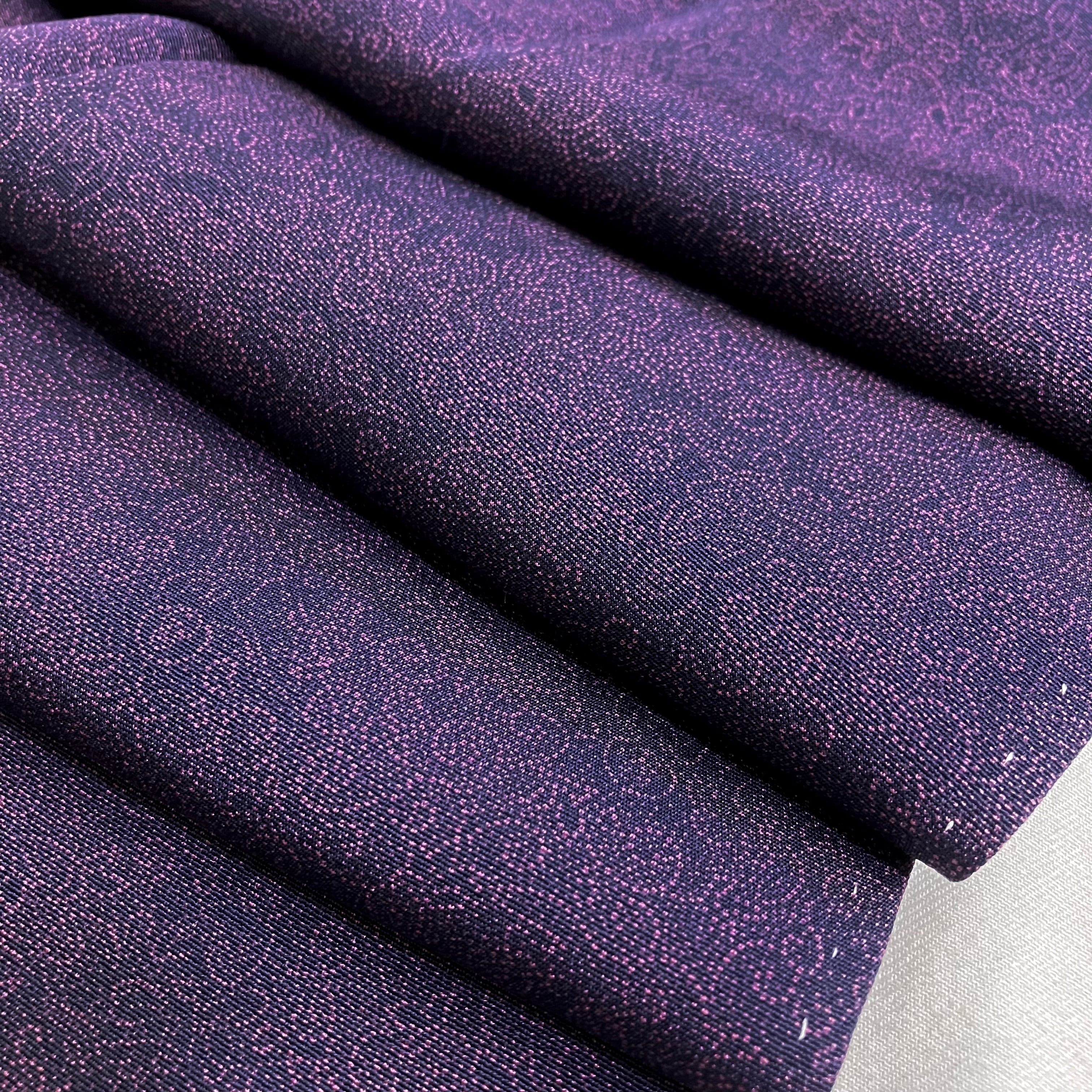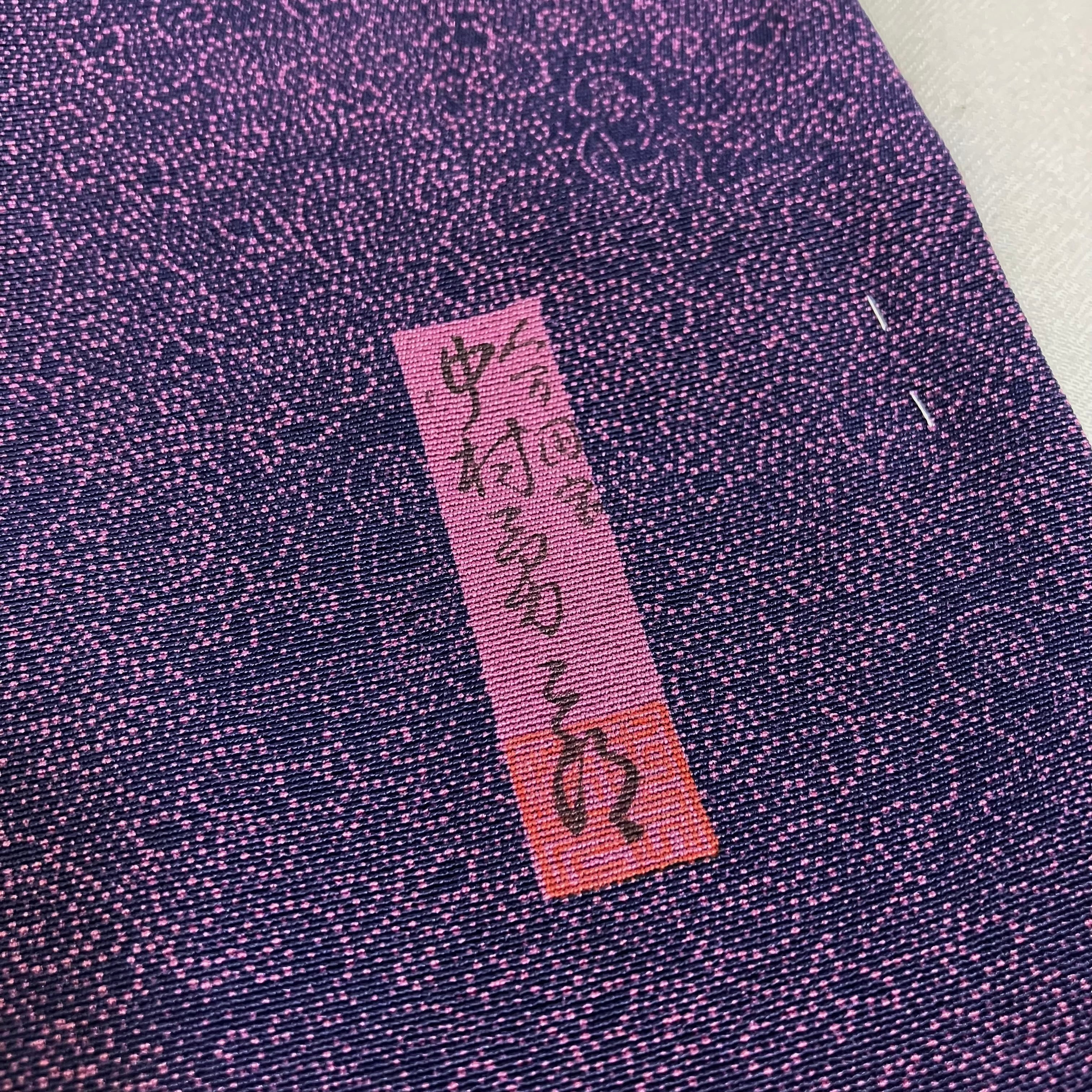 しなやかな手触りの良質な重め一越縮緬の生地に、暗い紫根色で地染めし、唐草と仏像の柄を赤紫色の江戸小紋染で丁寧に重ね染した逸品です。