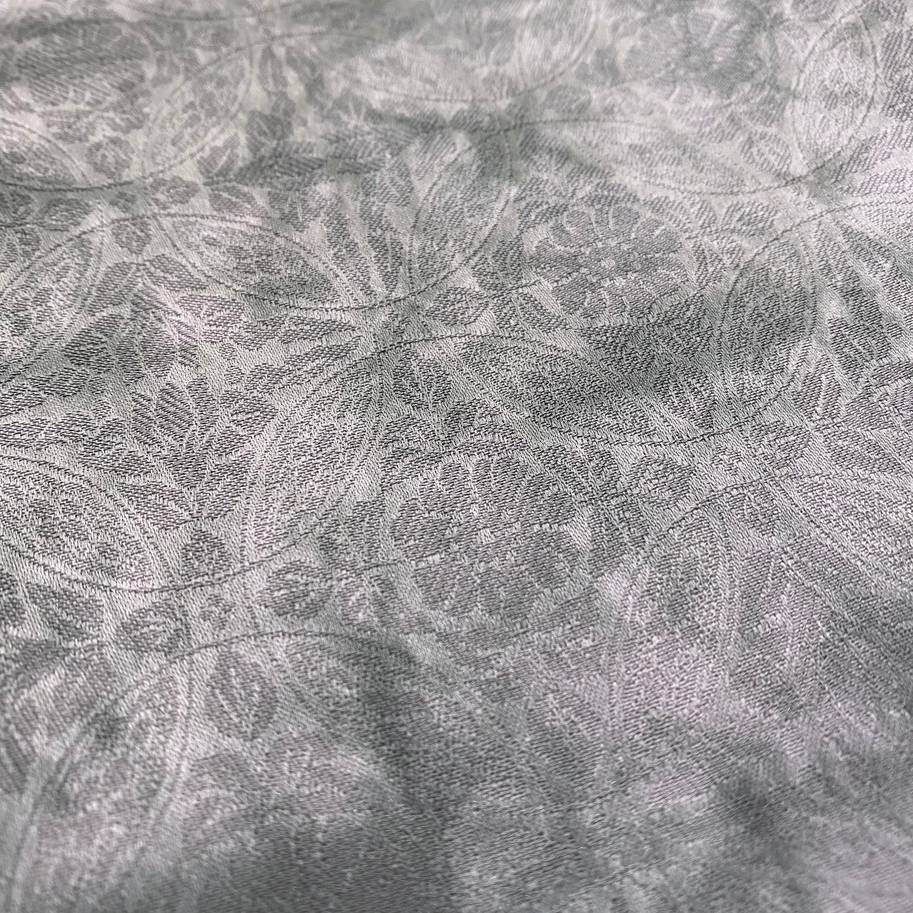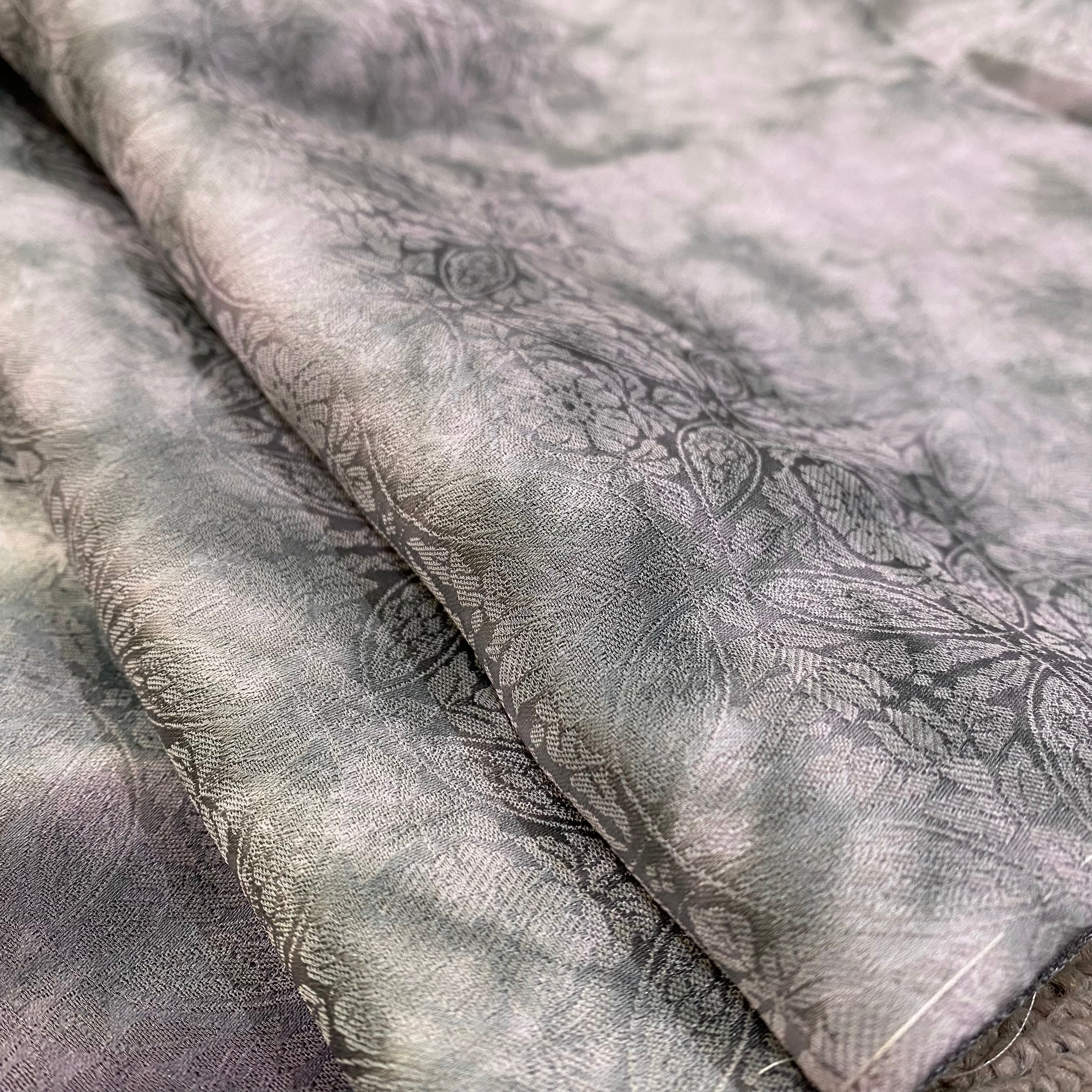スベリの良い手触りで光沢のある七宝華紋の地柄を織り込んだ良質な紋意匠の生地を銀ネズに木賊(とくさ)色の濃淡暈しを加えて地染めし、上前からの曲線暈しを裏葉色や二藍などに菱華紋を鉄紺と銀彩で重ね染めした品です。
